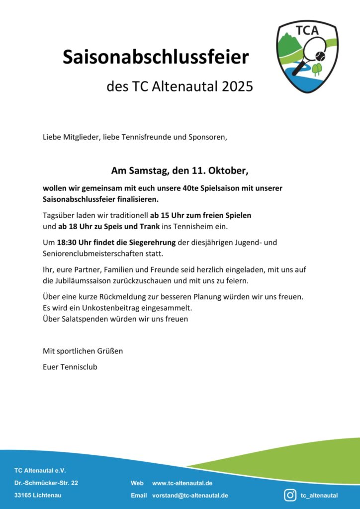 06 Okt. Saisonabschlussfeier 2025 Veröffentlicht am 6. Oktober 20256. Oktober 2025 von Tennisclub Altenatal e.V. Am 11.10.2025 wollen wir gemeinsam unser gelungene Jubiläumssaison feiern. Kommt gerne vorbei. 40. Jähriges Jubiläum